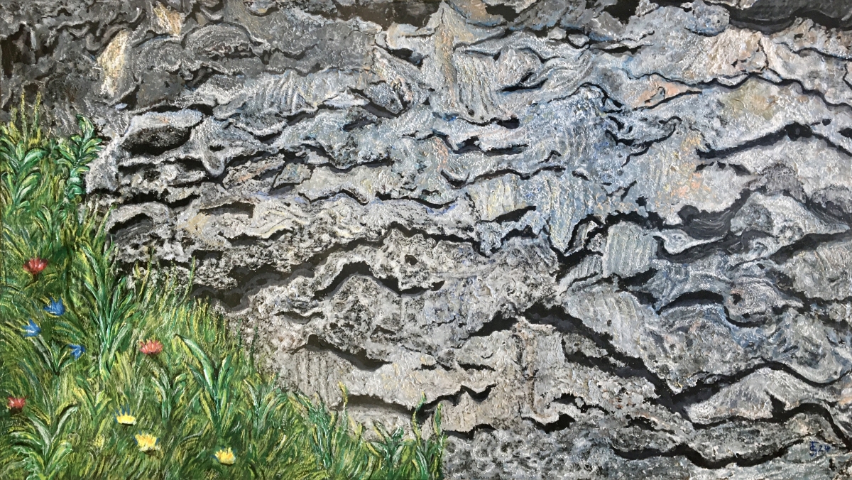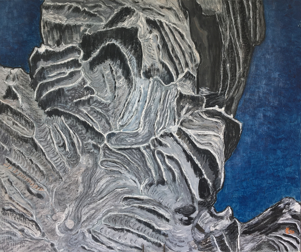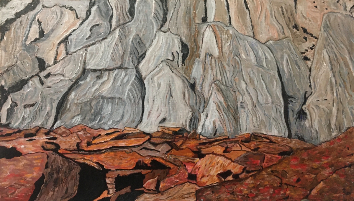 Eine Ausstellung. Im Freien. Weit bin ich aufgestiegen. Aus tiefem Tal. Jetzt sitze ich unter einem alten Ahornbaum. Er spendet Schatten. Und sein Schatten tanzt an der Felswand. Kreiert großartige Bilder. Und alles löst sich wieder auf. Der Fels - die Leinwand. Fein ziseliert - und grob. Dunkelgrau und schwarz. Blaugrau und weiß. Rotbraun, Ocker und Cremefarben. Eine Formen- und Farbenvielfalt.